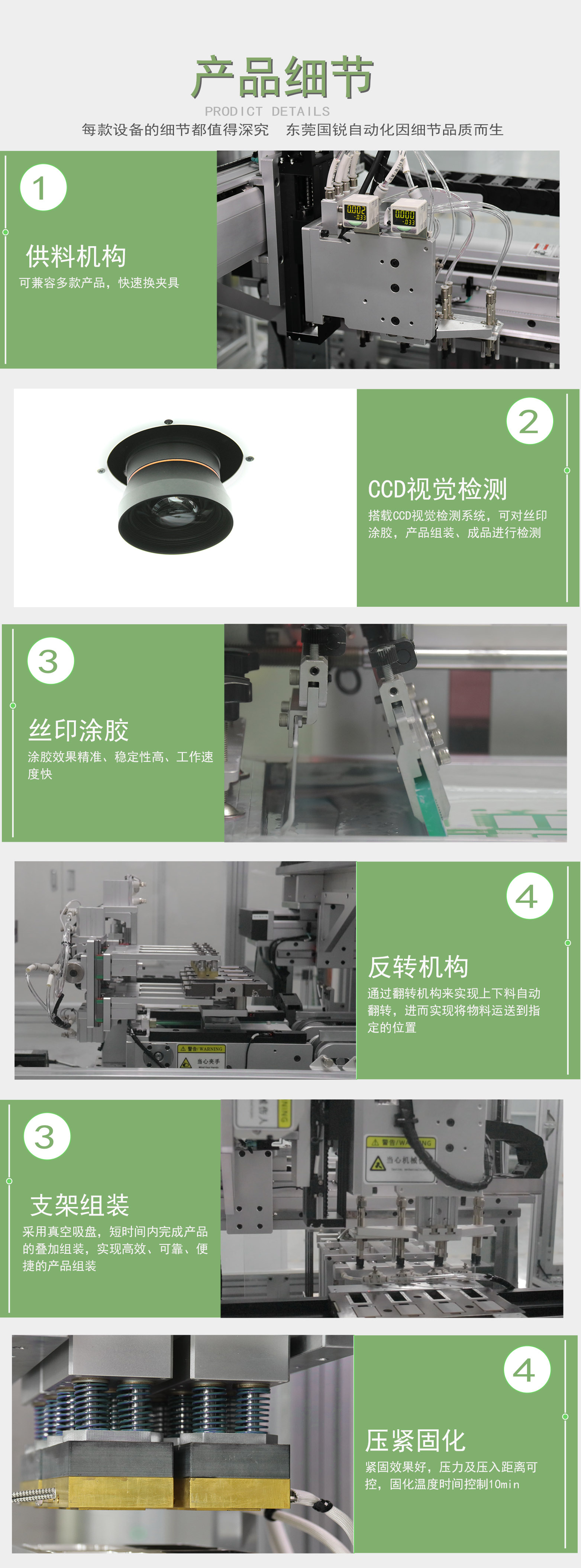 國銳自動(dòng)化在新能源汽車PTC加熱器組裝領(lǐng)域大放異彩,采用先進(jìn)自動(dòng)化技術(shù),展現(xiàn)出卓越的兼容性和靈活性。不論是單聯(lián)、雙聯(lián)還是四聯(lián)等多樣化產(chǎn)品的生產(chǎn)需求,都能迅速適應(yīng)并輕松切換生產(chǎn)模式,極大提升了生產(chǎn)效率。此外,公司還為某知名企業(yè)提供定制化PTC加熱器組裝線解決方案,滿足其獨(dú)特的客制化需求,展現(xiàn)國銳的領(lǐng)先技術(shù)與卓越專業(yè)能力。隨著新能源汽車市場(chǎng)的蓬勃發(fā)展和不斷擴(kuò)大,國銳積極響應(yīng)市場(chǎng)需求,成功落地多條新能源鋰電生產(chǎn)線案例。旨在為新能源汽車產(chǎn)業(yè)的持續(xù)發(fā)展貢獻(xiàn)一份力量。
