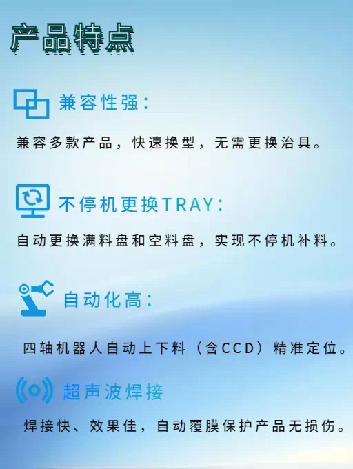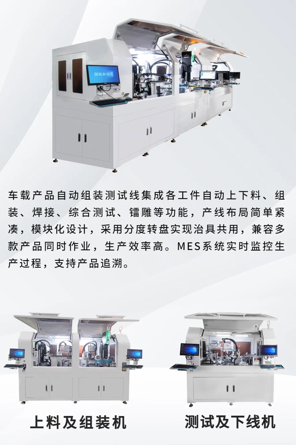 國銳自動(dòng)化車載產(chǎn)品自動(dòng)組裝測試線,專為汽車制造、電子零部件生產(chǎn)量身打造。采用先進(jìn)的TRAY盤堆疊供料與四軸機(jī)器人技術(shù),實(shí)現(xiàn)高精度、高效率的物料抓取與上料,同時(shí)配備CCD進(jìn)行物料狀態(tài)檢測。超聲波焊接技術(shù)確保焊接快速、焊縫美觀,暗箱測試配備優(yōu)質(zhì)吸波棉材料,為產(chǎn)品提供理想測試環(huán)境。轉(zhuǎn)盤式治具結(jié)構(gòu)支持多款產(chǎn)品同時(shí)作業(yè),快速換型節(jié)省寶貴時(shí)間。此外,激光打標(biāo)技術(shù)不僅減少耗材,還便于產(chǎn)品追溯。