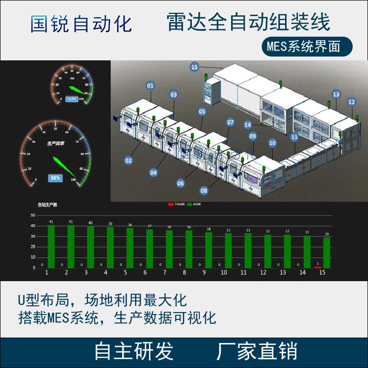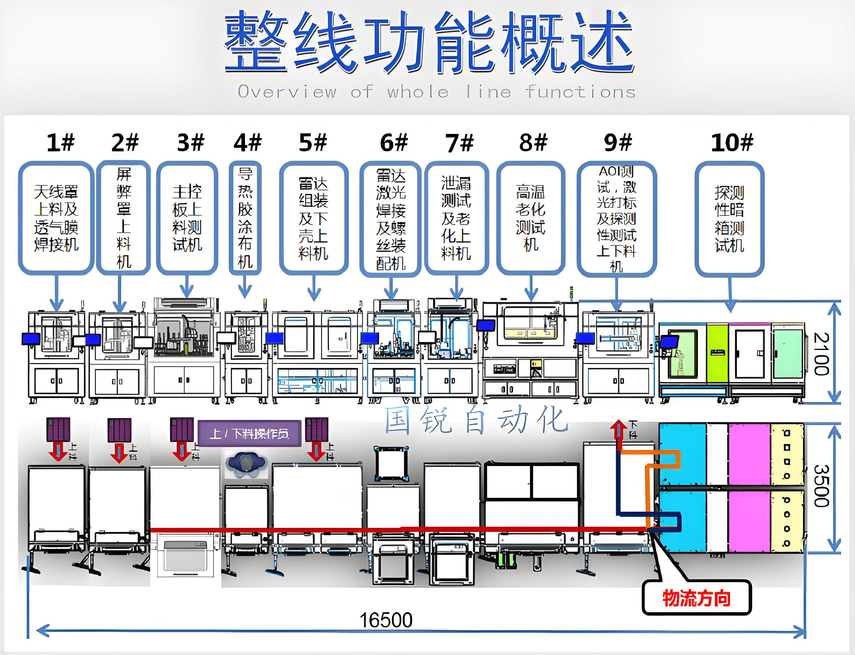 國(guó)內(nèi)首條自主研發(fā)的軍用/民用雷達(dá)自動(dòng)化生產(chǎn)線,采用U型線布局,通過機(jī)器人和先進(jìn)自動(dòng)化技術(shù),實(shí)現(xiàn)了生產(chǎn)線上各個(gè)環(huán)節(jié)的無(wú)縫銜接,各功能模塊化設(shè)計(jì)的方式實(shí)現(xiàn)了物料的自動(dòng)供應(yīng)、靜電消除、組裝、激光打標(biāo)讀碼、PCBA板燒錄、PCBA板測(cè)試、貼導(dǎo)熱膠、PCBA板壓入保壓、鎖螺絲、氣密性測(cè)漏、老化測(cè)試及暗箱測(cè)試等功能。針對(duì)不同自動(dòng)化程度的生產(chǎn)需求,我們?cè)O(shè)計(jì)并推出了全自動(dòng)生產(chǎn)線與半自動(dòng)生產(chǎn)線兩種模式,旨在提供一種集成的組裝及測(cè)試解決方案,以滿足市場(chǎng)對(duì)于效率和品質(zhì)的雙重追求。